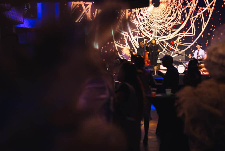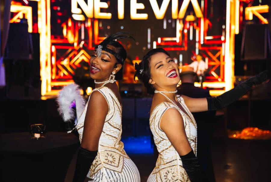 Add silk aerialists, performing breathtaking acrobatics, and spectacular theme inspired branded visuals on the big screens and the grandeur of the 1920’s became clear. VIP guests on the mezzanine level enjoyed networking opportunities and an elevated waiter service.