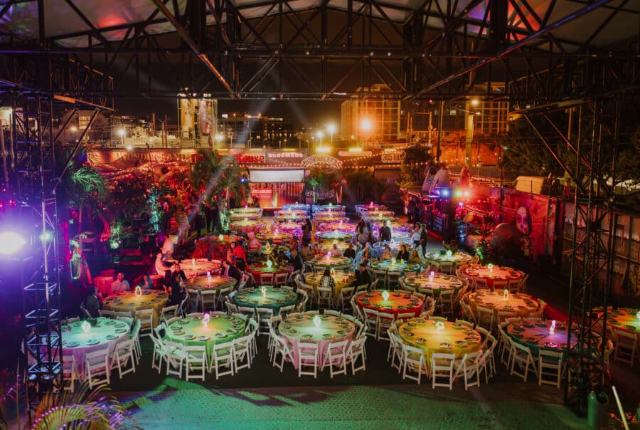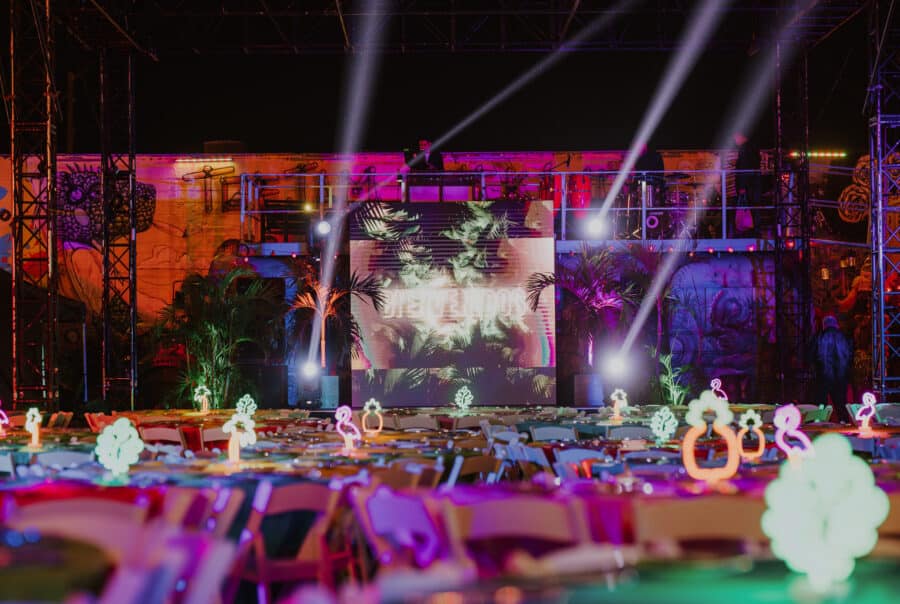 Guests were welcomed by stilt walkers in tropical costumes and enjoyed a lively VIVO band with DJ, percussionist and saxophonist playing Latin beats. Bright, punchy décor filled the venue—think palm leaves, lots of color, and neon signs!